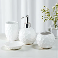Bring style and convenience to your sink counter with this beautiful bathroom accessories set for home that stands out for its utility and aesthetic. The bathroom set 4 piece is easy to clean, chip-resistant and built to last through everyday use.